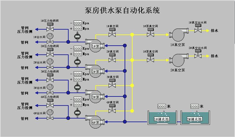 通過西門子SMART200PLC控制每個濾池的自動工作,由工業交換機組成以太網系統。主控制室由研華工控機安裝力控網絡版組態軟件,實際對各個濾池工作狀態的遠程監控。計時反沖、定時反沖相結合,保證水廠產水的各項需要,生產數據設定好后,無需人為參與。